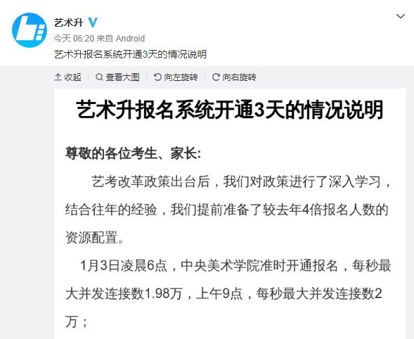 艺术升也解释,2019年艺考政策调整,全国艺术校考院校减少、考点削减,加上考点容量限制等原因,造成大量考生集中报名院校部分考点的情况,因此出现了一系列问题。而西安美术学院、天津美术学院本科报考人数呈5倍数增长,远超出2019年报考人次预期,因报名人数过多等因素造成报名系统卡顿及暂时维护属临时突发状况。