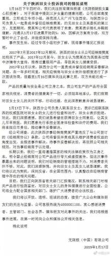 无限极公司昨晚发布的情况说明中称,1月16日下午4点左右关注到有关媒体对陕西田女士投诉我公司的报道,公司总部对此高度重视。立即成立专项小组,连夜派人从广州飞往西安,与陕西分公司负责人一起责成并督促经销商樊某,约见田女士及其委托的第三方见面。见面期间,樊某和公司代表表明了来意,樊某表示赔礼并鞠躬道歉。沟通从17日凌晨开始到五点半,因补偿问题有分歧,双方暂时中止了会话,并继续保持沟通。