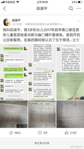 微博认证为"幼童疑因无限极致心肌损害事件当事人田淑平"的网友爆料称,2017年,她3岁的女儿被诊断为"幽门螺杆菌感染"。过了没多久,就在一位"发小"的介绍下,认识了陕西商洛的"无限极指导老师樊乐":"当时孩子就是早上起来有点口臭,带孩子去医院检查,诊断是消化不良,幽门螺旋杆菌感染。因为我也又没得过这病,我就不知道。头一次他们(无限极)跟我说这个幽门螺旋杆菌很可怕,怎么怎么严重,会致癌,反正都说的特别的害怕。然后就让我相信它,‘无限极没有解决不了的问题。’"