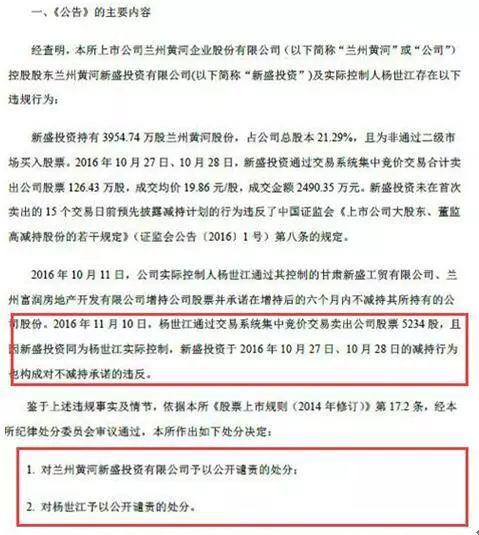 兰州黄河董事长杨世江违规减持遭公开谴责(资料来源:深交所)