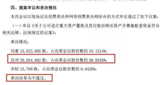 在上述重组预案公布后,兰州黄河收到深交所的问询函,其中问询内容达五大项18小项之多,关注重点落在置入标的高管变动、关联采购和业绩承诺等方面。不过,兰州黄河的这次重组最终"卡"在了股东身上。对于重组预案,股东赞成和反对的票数差异并不大。以第一项议案为例,同意约1582万股,占出席会议股份数的43.1214%;反对约2085万股,占出席会议股份数的56.8358%。而没能通过的原因,有分析人士认为可能与注入资产高溢价有关;也有说法是,中小股东希望能有更优质的资产被注入上市公司。
