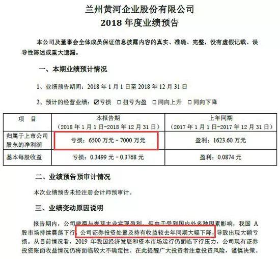 兰州黄河2018年因炒股预亏6500万元-7000万(资料来源:业绩预告)