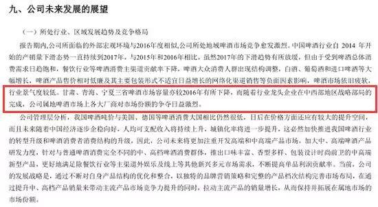 兰州黄河在2017年年报中坦承:"甘肃、青海、宁夏三省啤酒市场容量下降,随着行业龙头企业在中西部地区战略布局的完成,公司属地啤酒市场上各大厂商对市场份额的争夺日益激烈。