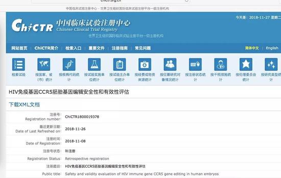 11月27日,21世经济报道记者以"贺建奎"为关键词查阅中国临床试验注册中心发现,以其为临床试验研究负责人的有两个注册题目,一个是《HIV免疫基因CCR5胚胎基因编辑安全性和有效性评估》,正是11月26日媒体报道的2名基因编辑婴儿诞生的临床试验项目;另一个是《重大遗传疾病基因治疗的安全性评估》。