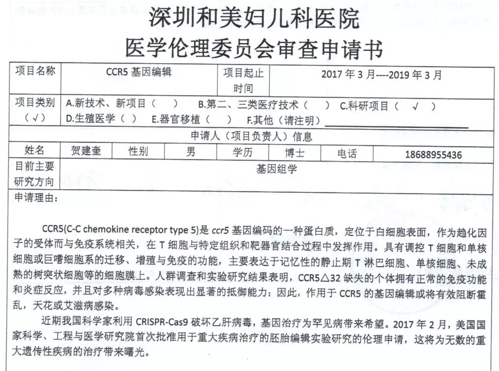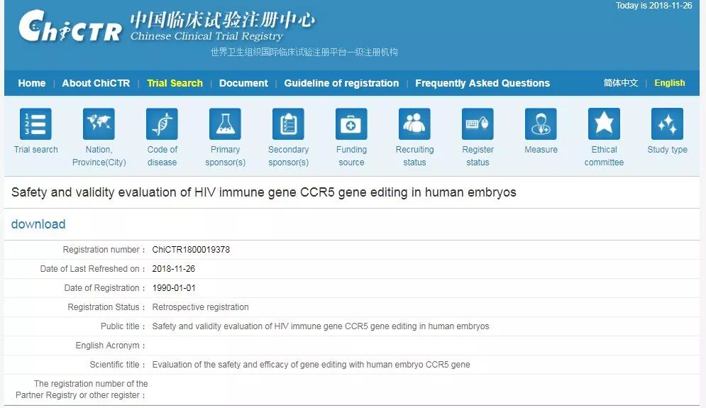 贺建奎团队此次实验的相关注册资料。来源:中国临床试验注册中心