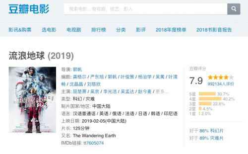 目前《流浪地球》在豆瓣电影的评分为7.9分,好于86%的科幻片。《战狼2》在豆瓣电影的评分为7.0分,好于63%的动作片。
