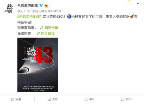 【TechWeb】2月25日,国产科幻电影《流浪地球》累计票房突破43亿元,成为仅次《战狼2》的中国电影票房亚军,离《战狼2》的56亿票房还差13亿。