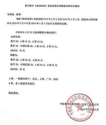 2月22日,中影数字电影发展(北京)有限公司向各院线、影管部门发布了"数字影片《流浪地球》密钥延期及调整最低票价的通知"。通知要求,电影《流浪地球》所有版本从3月6日~5月5日进行密钥延长,将延长上映2个月,同时从2月25日开始,将各类型最低票价下调了10元。降价后数字2D的B类票价仅需20元。
