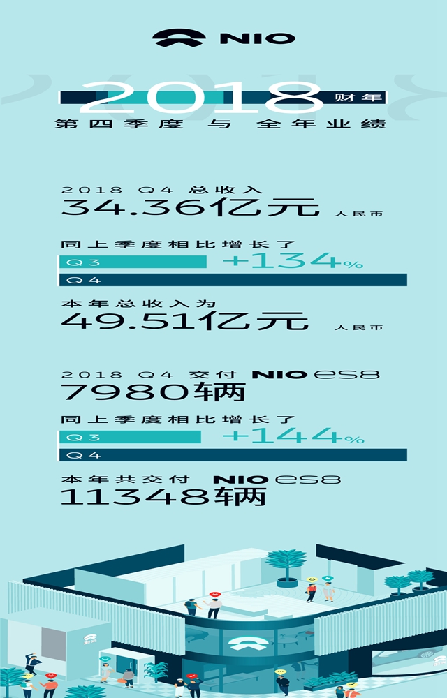 其中,2018年第四季度ES8产量为8,069辆,相比于第三季度4,206辆增长91.8%。2018年ES8总产量为12,775辆。第四季度ES8交付数量为7,980辆,相比于第三季度3,268辆增长144.2%。第四季度总收入为34.356亿元人民币(4.997亿美元),同上季度相比增长了133.8%。第四季度毛利率为0.4%,上季度毛利率为负7.9%。