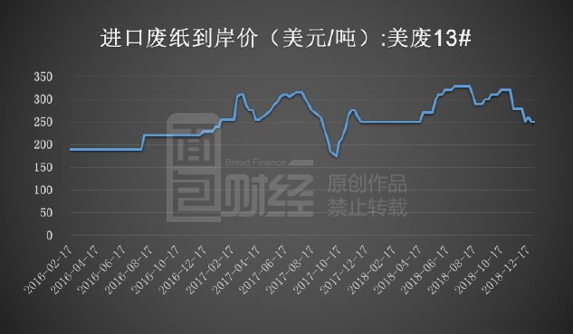 2017年底以来,国家陆续出台了禁止混杂废纸进口、禁止年产能5万吨以下的企业利用进口废纸以及废纸进口混杂物不高于0.5%等政策。以美废13#为例,其价格从2017年10月的最低点175美元/吨上涨到了2018年中旬的330美元/吨,截至2018年底仍然维持在250美元/吨左右。