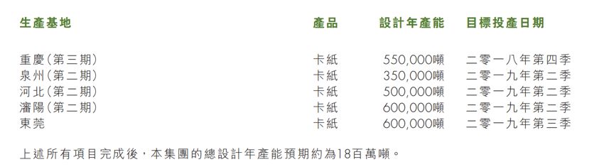 2017年8月,公司的越南基地二号纸机投产,设计产能35万吨卡纸,并于2018年1月正式开始商业生产。