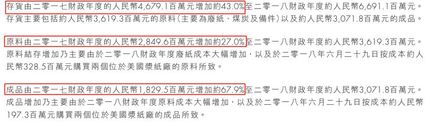 公司2018财年年报显示,存货增长了43.0%,涉及金额超20亿。其中,原料增长约27.0%,成品增长约67.9%,主要原因都是废纸成本的大幅增长。