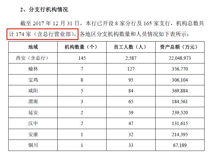 截至2017 年12 月31 日,西安银行已开设8 家分行及165 家支行,机构总数共计174 家(含总行营业部)。机构数量分布陕西省下属9个地级市,省会西安145家占比达83%。